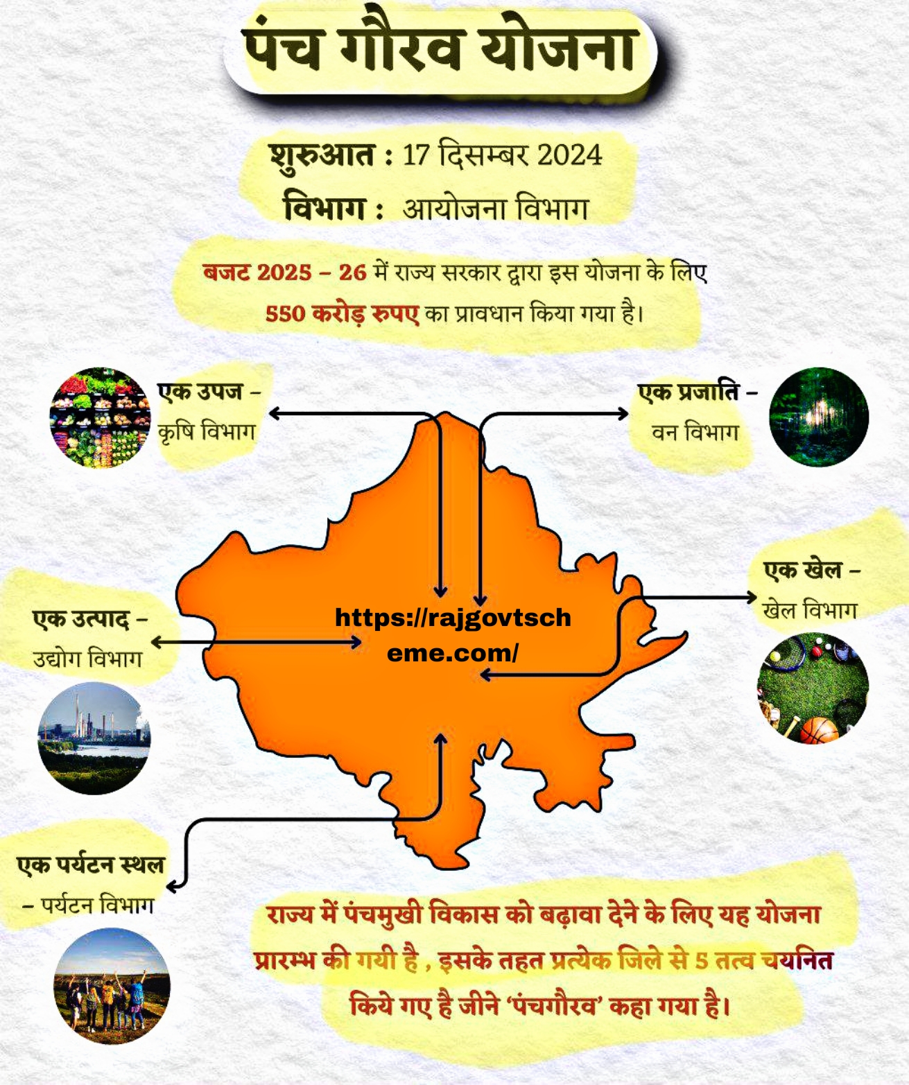 राजस्थान सरकार द्वारा पंचगौरव योजना की शुरुआत 17 दिसंबर 2024 को आयोजना विभाग द्वारा की थी जिसके माध्यम से राज्य में प्रत्येक जिले के पांच उत्पाद को बढ़ावा दिया गया जिन्हें पंचगौरव कहां गया है